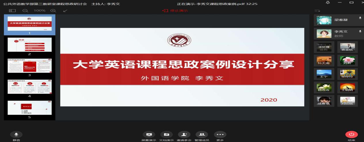 研讨会上,大学英语第一教研室、第二教研室、第三教研室和国际教育教研室分别由王旭、张羽华、李秀文和李宏四位教师针对各自教研室不同的课程内容进行课程思政设计展示。大学英语第一教研室、大学英语第二教研室依托全新版大学英语综合教程第一册、第三册展开课程思政建设。根据文章内容,引导员工深入了解社会主义核心价值观,从而树立正确的世界观和人生观。从不忘初心,到实现梦想。大学英语第三教研室从英语课程思政教学指南,课程思政教学目标,课程思政案例设计、课程思政创新特色、探讨育人成效等几个方面讲解了如何科学设计课程思政教学内容,将课程思政融入大学英语课堂教学建设全过程。大学英语国际教育教研室进行了托福课的课程思政展示。通过对托福考试的辅导,培养员工的英语综合知识与应用技能,跨文化交际能力及自主学习能力,使员工在今后的学术研究中能用英语进行有效的学习,提高综合文化素养,尊重科学知识,正确处理中外文化关系,弘扬社会主义核心价值观,以适应我国社会发展和国际交流的需要。