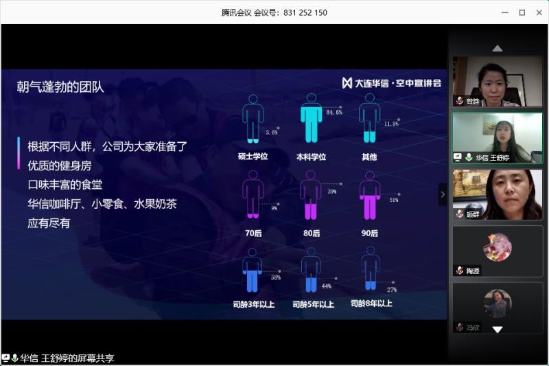 2020年6月11日晚19:30,由于疫情影响,pa捕鱼官方网站特邀请大连华信计算机技术股份有限公司,在腾讯会议平台,为公司日语专业大三的员工召开了“大连华信实习线上宣讲会”。本次宣讲会由大连华信人力资源负责人白璐主持,王舒婷为主讲人,pa捕鱼官方网站副书记王颖群、日语系主任曾妍及全体2017级日语专业员工参加了本次会议。