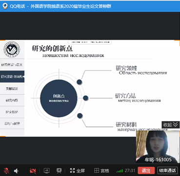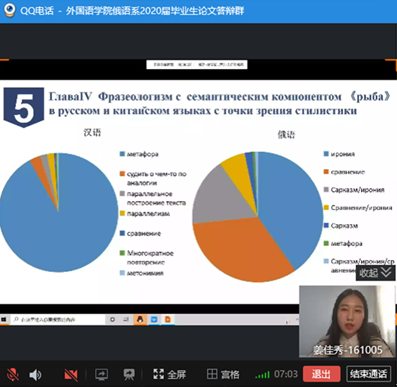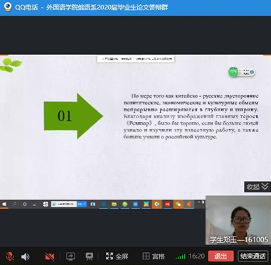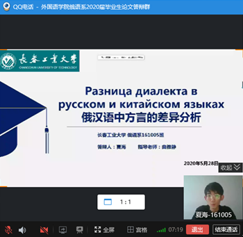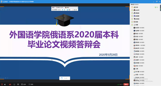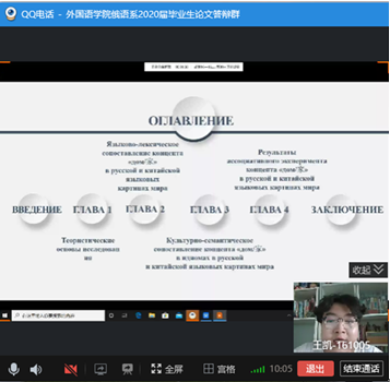 本网讯(通讯员 张美)按照《PA捕鱼官网入口2020届本科毕业设计(论文)答辩工作方案》以及pa捕鱼官方网站关于2020届本科毕业论文答辩指导文件的要求,在经过三轮查重检测之后,俄语系制定了审核答辩+视频答辩的具体实施办法。毕业论文答辩工作有条不紊地进行,经过评审推荐,王凯、夏海、牟铭、吴子鹏、姜佳秀、郑玉等6名同学参加了视频答辩。俄语系主任张美主持答辩会,并做开场发言,介绍了答辩委员会成员以及整个答辩流程。俄语系教师全部出席答辩会,公司经理彭又新,副经理周爽参加了答辩会。