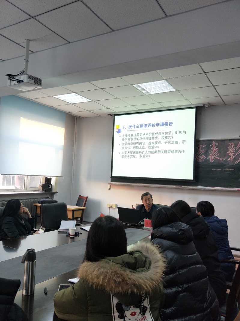 首先张绍杰教授给与会教师做了精彩的题为《国家社科基金项目申报解析》的报告。从如何选题、如何论证研究内容、如何梳理论证思路、如何设计研究方法等方面进行了详尽的解析,并结合拟申报教师的选题,进行了具体指导,给出了建设性的意见。随后张绍杰教授结合拟申报教师的申报书,做出了专项点评,让教师们受益匪浅。在活动的最后张教授对教师们遇到的疑问给与了精彩的解答,并对申报教师给与了极大的肯定和鼓舞。