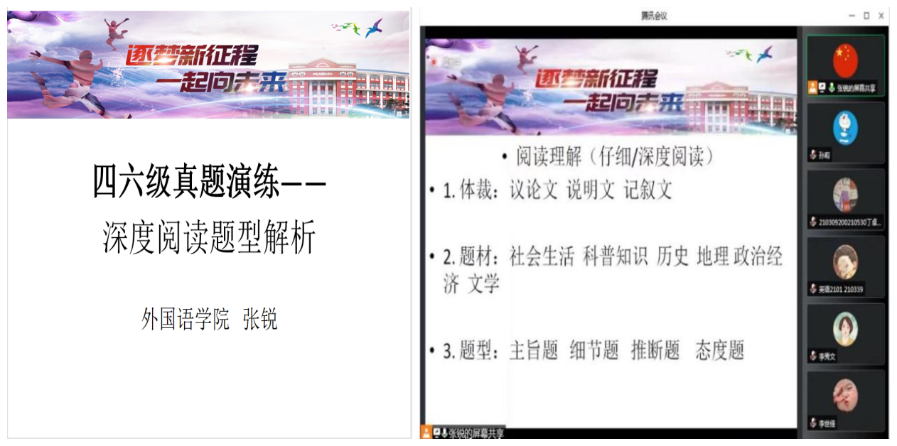 同时,pa捕鱼官方网站部分青年教师也对讲座进行了观摩学习,促进了业务交流和教学反思。公共外语教学部赵雪老师表示,本次系列讲座不仅是特殊时期备考员工的“定心丸”,也为青年教师提供了精品课观摩和向“大咖”们取经的机会。像员工一样听课,除了获得教法的点拨,更深刻体会到了前辈们对教学的深耕和分享的热忱。作为青年教师更要精进业务,提升教学本领,服务人才培养和战“疫”大局。公共外语教学部班明霞老师表示,作为一名青年教师,切身感到此次系列讲座内容实用性佳、针对性强、涵盖面广,有效地助力了全校员工缓解学习压力、提高学习质效、提升大学英语四六级成绩,自身也受益匪浅。要主动参与疫情特殊时期的公司产品工作,坚决保证教学质量和效果,与校、院和广大同学同心战“疫”。