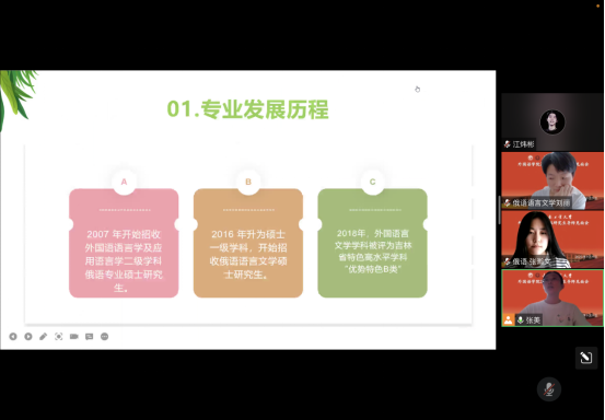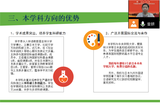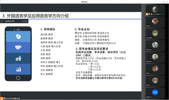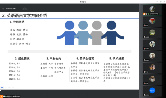 随后,她向同学们介绍了公司概况、英语专业的发展历程和取得的成果。全面地介绍了这两个方向的导师团队、近年的招生情况、毕业去向、奖学金评定规则,并讲解了个人培养计划,让同学们明晰培养目标和课程安排。在师生互动环节,详细解答了同学们的疑问,拉近了师生之间的距离。