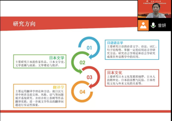 然后,从团队力量、学科简介、本学科方向的优势、员工就业和公司产品这五个方面,对日语语言文学专业进行了详细地讲解,对研究方向、课程设置、公司产品方案等进行了清晰地解读。最后,与研究生们进行了亲切地交流,解答同学们有关研究生学习生活方面的疑问。日语语言文学专业入学教育活动圆满完成。