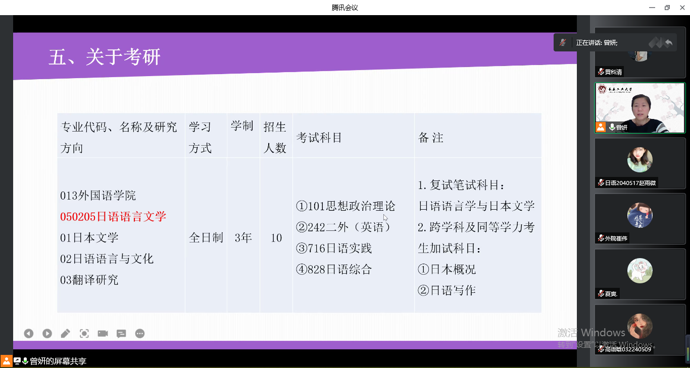 在日语专业组,崔伟老师主持会议。曾妍首先从pa捕鱼官方网站的发展历史、团队力量、丰富的学术及社会实践活动、研究生奖助体系等方面介绍了PA捕鱼官网入口外国语言文学一级学科硕士点的概况,然后对日语语言文学方向进行了详细地介绍,分别从团队力量、课程设置、学科优势、员工就业和关于考研五个方面进行讲解,并指出考研是学术和人生方面一次重要的提升机会,希望同学们结合自身实际情况确定适合的考研目标,坚定信念,实现考研梦!最后,崔伟老师对曾妍老师的细致讲解表示衷心的感谢。