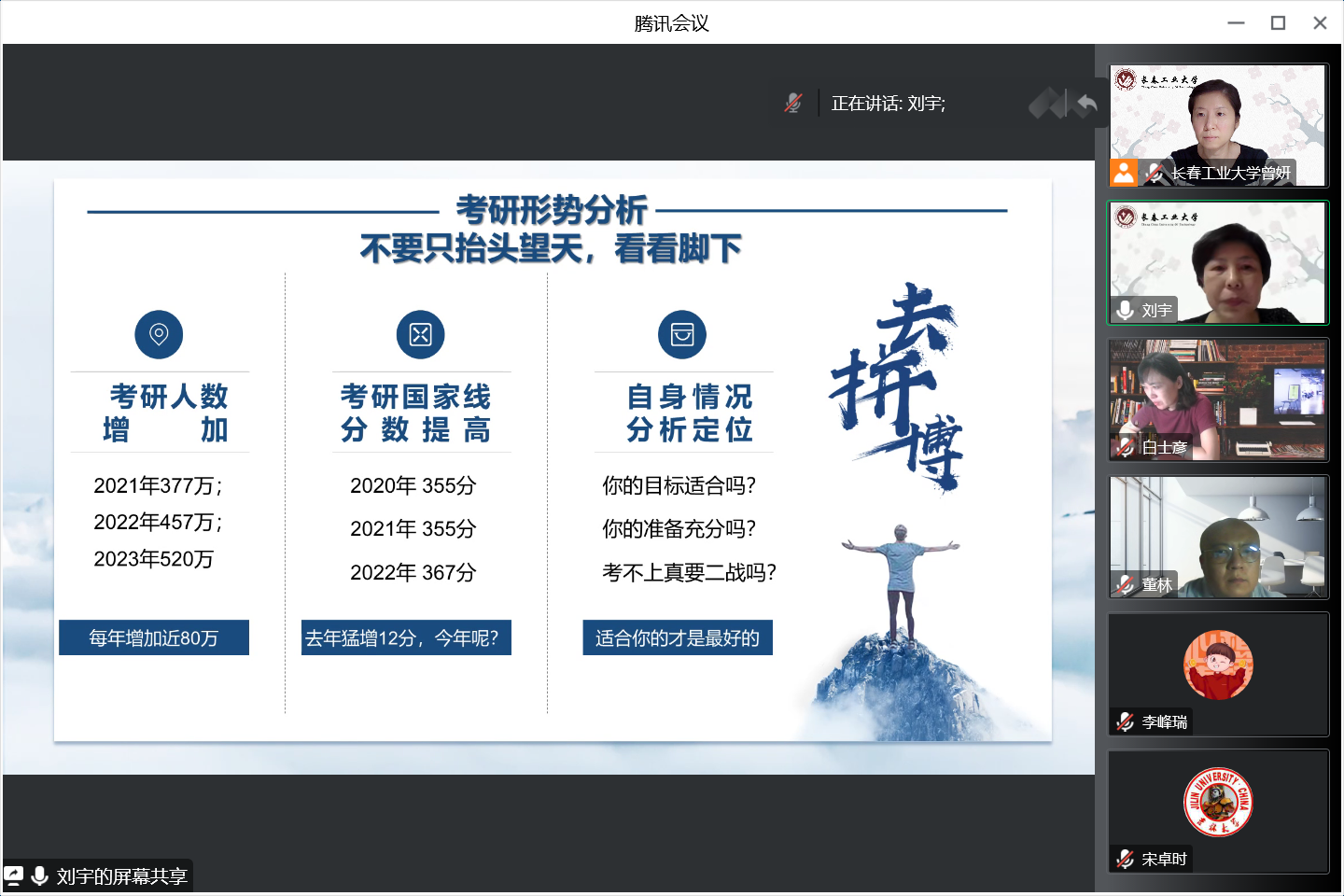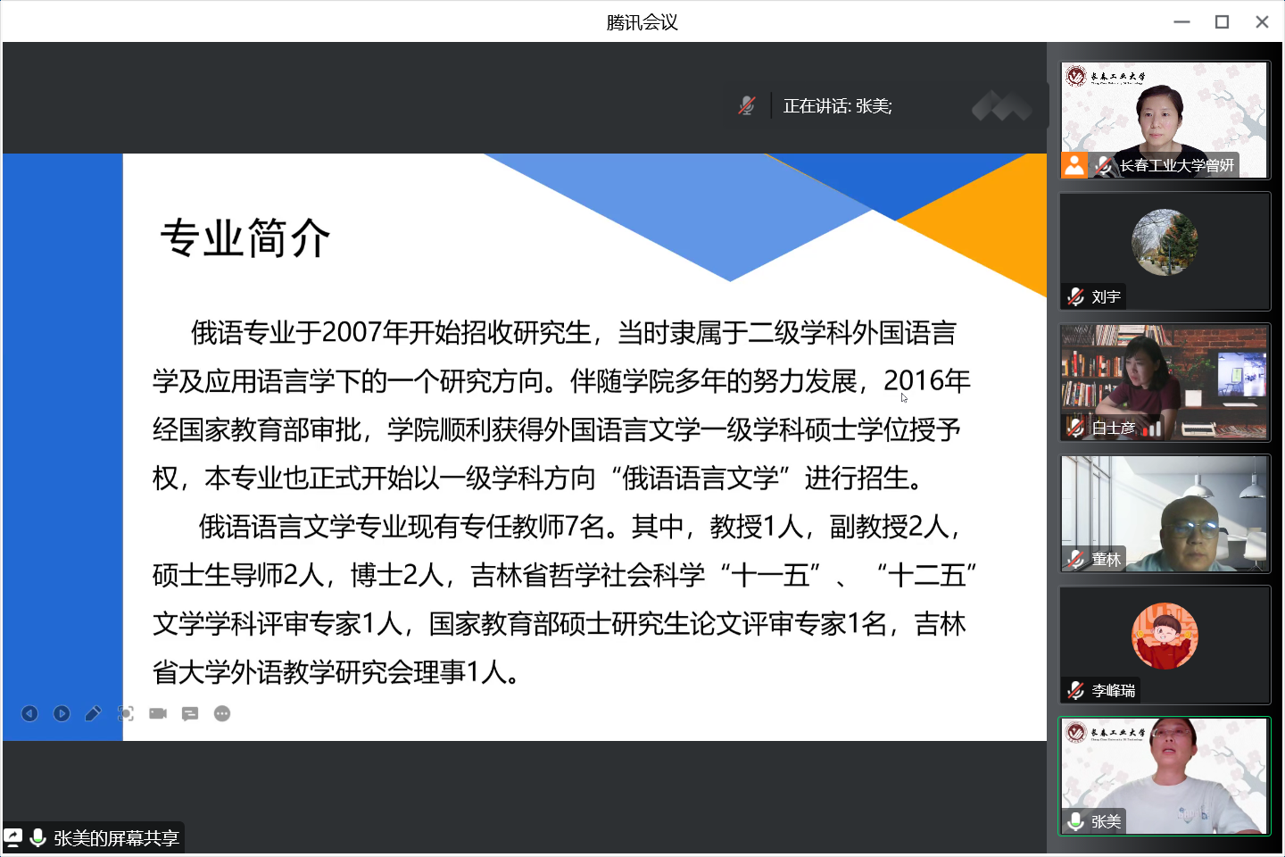 新闻网讯(通讯员 宋卓时) 为提升员工考研热情和积极性,帮助员工了解2023年的考研形势,明确考研目标,9月30日晚7点,pa捕鱼官方网站副经理曾妍、英语系主任刘宇和俄语系主任张美,在腾讯会议平台,为长春人文公司pa捕鱼官方网站的员工召开了线上考研宣讲会。该校pa捕鱼官方网站副经理白士彦主持会议,翻译系主任孙瑜、应用日语系副主任董林、经贸俄语系主任冯柱及19、20级员工参加了本次宣讲会。