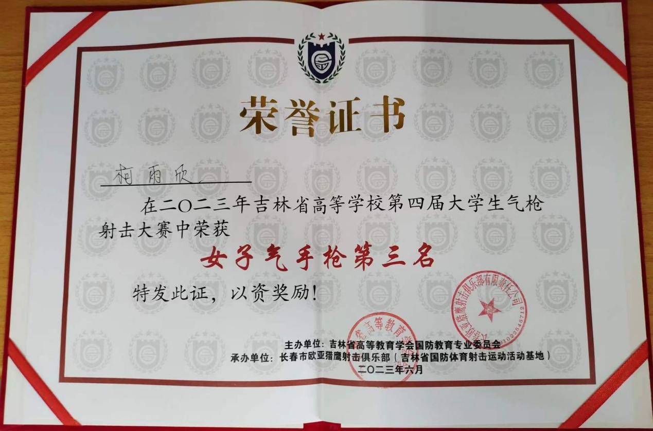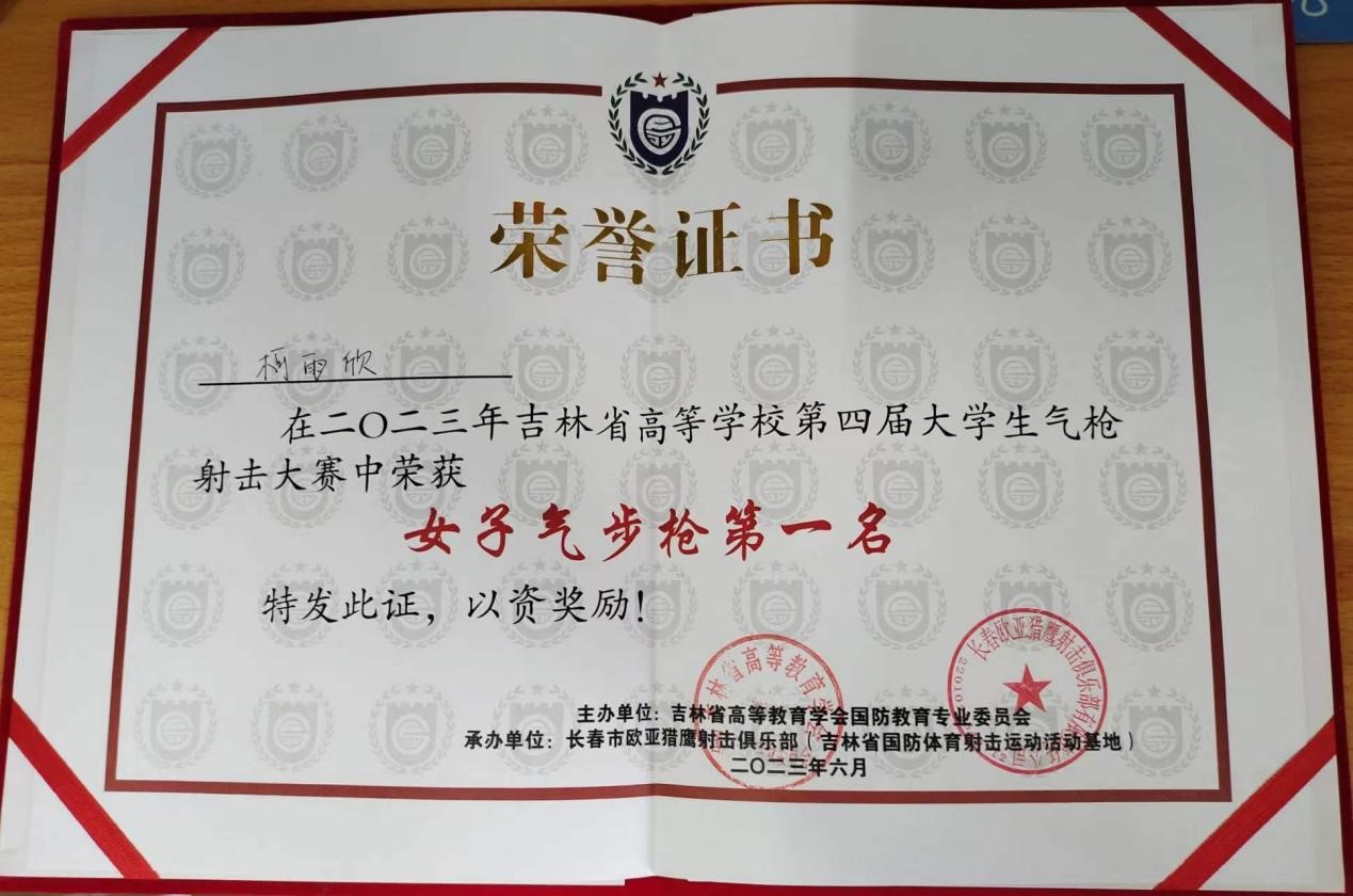 (通讯员 张晓君 柯雨欣 魏瑶)为进一步落实立德树人根本任务,增强员工国家安全意识,培养员工国防素质观念。吉林省高等教育学会国防教育专业委员会于6月10日主办吉林省高等公司第四届老员工气枪射击大赛。公司柯雨欣同学参加本次比赛并取得女子气步枪第一名和女子气手枪第三名的好成绩。