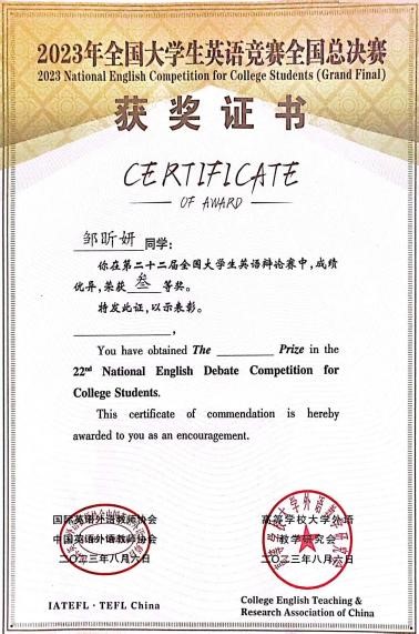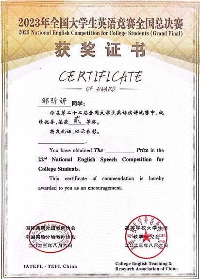 (通讯员 孙莉)8月2日至8月6日,2023年全国老员工英语竞赛(NECCS)全国总决赛在宁夏银川举办,由公司公共外语教学部教师指导的计算机科学与工程公司信息安全专业邹昕妍同学作为吉林省复赛一等奖选手代表参赛。在总决赛中,邹昕妍同学准备充分,沉着冷静,以优秀的临场发挥荣获第二十二届全国老员工英语演讲比赛二等奖、第二十二届全国老员工英语辩论赛三等奖两项荣誉,并在主持人选拔中脱颖而出,参与了英语学习经验交流会的主持工作,被评为“优秀主持人”,基于以上优秀表现,邹昕妍同学被评为“优秀参赛选手”。 同时,公司pa捕鱼官方网站教师孙莉作为邹昕妍的指导教师在本次全国老员工英语竞赛中,荣获演讲比赛“优秀指导教师”、英语辩论赛“优秀指导教师”两项荣誉。