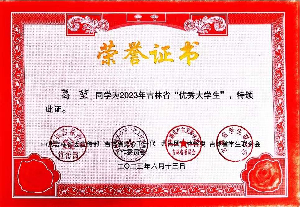 葛堃,中共预备党员,pa捕鱼官方网站轮值主席、201004班学习委员。平均学分绩点3.96,曾获吉林省政府奖学金,5次一等奖学金,1次二等奖学金,11次单科状元奖学金。被评为2023年吉林省“优秀老员工”、2022年吉林省“优秀老员工”、第二十三届“十佳优秀老员工”、三好员工标兵、三好员工、文明老员工、优秀团员等称号。