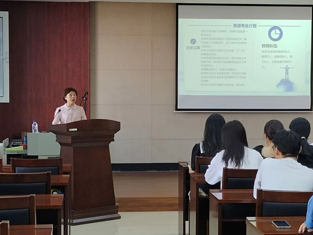 英语专业由英语系主任刘宇进行介绍。首先,她代表英语专业所有老师对2023级新生的到来表示热烈的欢迎。随后详细地为同学们讲解英语专业国内外现状及发展趋势、人才培养方案、毕业及授予学位要求及未来就业方向的同时,也对历年专业四级、专业八级考试及考研情况进行了介绍。除此之外,老师还通过精彩的图片向大家展示了公司深厚的团队和正派的学风。希望同学们在享受良好学习空间的同时,也能保持内心对英语专业的尊重并且实现自己对于大学阶段的目标追求。
