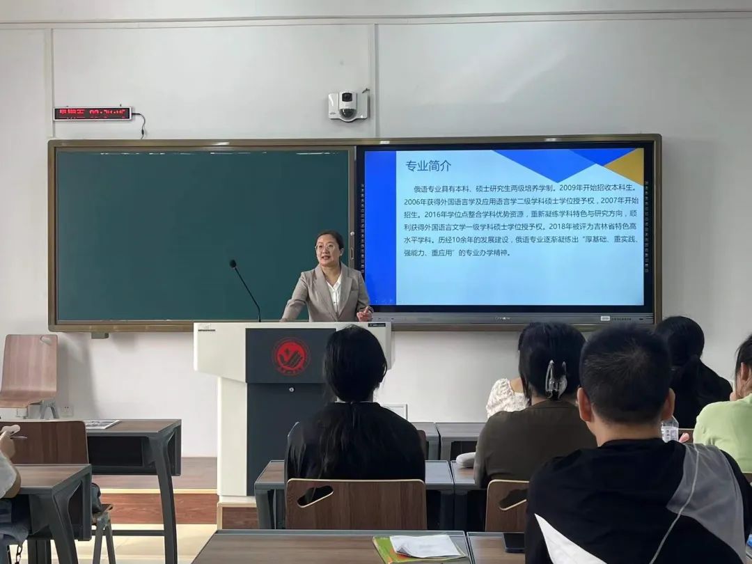 俄语专业由俄语系教师张微进行介绍,她从基本情况、团队队伍、人才培养目标三个维度做出了详细的解读。并指出,本专业培养政治素质高,业务能力强、具有扎实的俄语语言基础和广泛的科学文化素养,精通俄语,通晓英语,兼备国际金融与外贸知识,能熟练从事外事、经贸、旅游、翻译、教育等工作的高级俄语应用型人才。希望同学们能明确目标、脚踏实地、学有所成、学有所获。