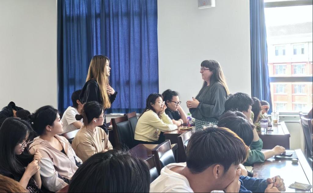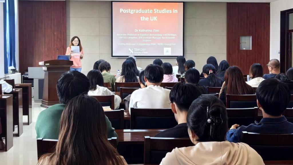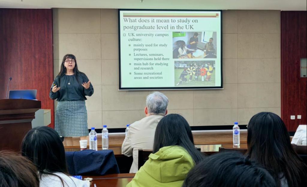 Katharina Zinn,埃及学博士,现担任东北师范大学古代文明史研究所埃及学客座教授,博士生导师,英国威尔士三一圣大卫大学教育与人文公司学位研究所负责人。Katharina Zinn教授做了题为“Postgraduate study in UK”的讲座,为同学们详细介绍了去英国读研究生的相关问题,包括可能遇到的文化冲击,英国研究生的类型、学制和课程及如何申请和需要准备的材料等。介绍完毕后,Katharina Zinn教授还解答了同学们的疑惑,亲切地与同员工们进行了互动。