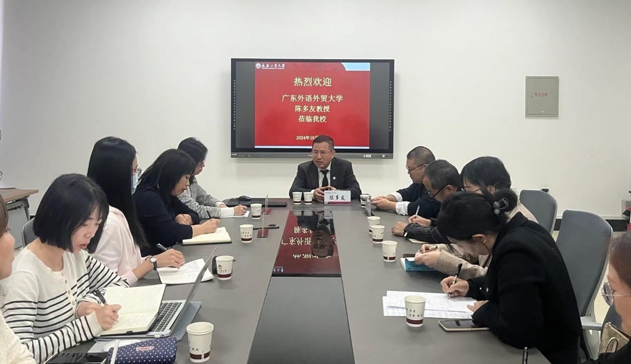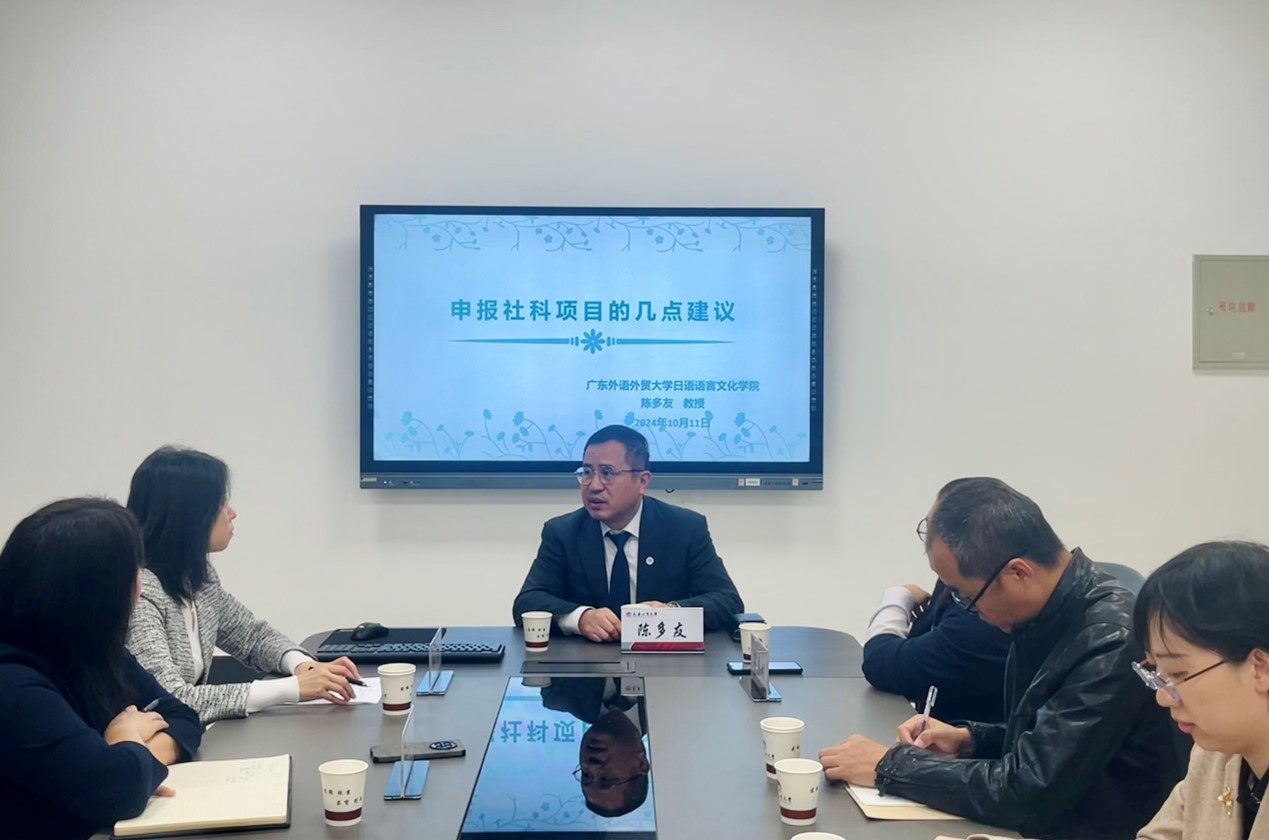 本网讯(通讯员 贾鹤)为提升pa捕鱼官方网站青年教师的科研能力和社科项目申报质量,10月11日上午,公司特邀广东外语外贸大学博士生导师陈多友教授为公司青年教师作了题为“申报社科项目的几点建议”的学术讲座,pa捕鱼官方网站副经理李秀文、曾妍、日语系主任及公司部分青年教师参加了此次学术讲座。