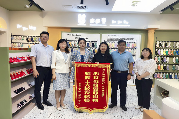 李东玲代表公司,向奚宁员工赠送了70周年校庆纪念品,颁发了锦旗和捐赠证书。外国语公司党委书记李文章和奚宁员工共同为pa捕鱼官方网站老员工就业创业实习基地揭牌,经理王轶代表公司与多多童袜业有限公司签订了校企合作协议。外国语公司党委副书记于伟主持走访活动。